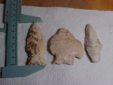 Easy to see the heat treating of the Snyders point in the center of the group--the iron oxides change the 'normally' off-white of the Burlington Chert a 'ruddy' color--you may have a different name for that coloration, but it's instantly recognizable as heat treating. The Snyders shows salvage attempt-after salvage, the Hopewell user found ways (and invented some I'd be hard-pressed to guess)--it worked for their needs--2&5/16" by 2", but still thin, 3/8" max thickness. The stemmed "Steuben" Woodland Culture point is 2&3/4" in length, a black, crunchy mineral build-up on the reverse face--the Adena Dixon is 2&9/16", it's stem edge ground, more heavily sharpened on one blade edge than the opposite side. The Lawrence County, Illinois, finder had some catalog numbers inked-on, but didn't pass along what those numbers indicted--the sites where the pieces were found are likely under a house or highway) now, anyway--a quick aside, one of my favorite sites (a long, low ridge) was used for fill for an interstate overpass. It happens. Three authentic points, real in every detail. Shipping is $8.00, checks or M.O>s welcomed. Sorry, I do not use paypal-type payment systems--Roy A.