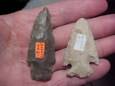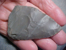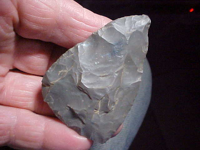 I've owned this C. Alexander piece for fifteen years, and like so much of his collection it was almost undoubtedly found years before that on an Ohio River "island' called "Flint Island". As the river would cut into the banks, the (in a few places) almost 3' thick midden, artifacts would tumble to the beach==the finder made it an 'every chance we can' hunting trip...you saw those size 15 shoeprints, you knew there was nothing left to find, lol. Flint Island was a 'way station' for any number of cultures as they'd load up canoes in Harrison County, Indiana, scoot back to the 'island' (protected by a slough on the back side) where they could hammerstone-crack open both nodules and large lense-found hornstone, lighten the load before paddling back downstream. Cultures, many of them Woodland, Adena and Hopewell, left tons of flint, even more tons of broken hammerstones, partial blades, points that likely got lost in the loose sand, and cookfire debris. Incredible midden--it's been almost thirty years since I was shown the site, the image stays with you, all that flint, all those broken hammerstones. This knife (Hopewell or Adena) measures 2&11/16" by 1&3/4", 7/16" max thickness--and a perfect example of what this "Lithic Workstation" was known for. Shipping is included with the price, checks, cash, or M.O.s are the only ways I take payment--sorry, paypal users, I use no electronic payment forms. All the best to your families for 2026--Roy A.& family