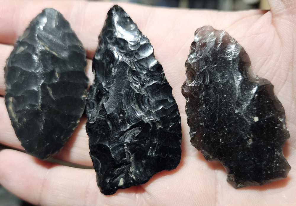 Awesome lot of obsidian blades with a fluted paleo in the middle. All found in Nevada and very nice for the price. Largest measures 2 1/4 inches long.