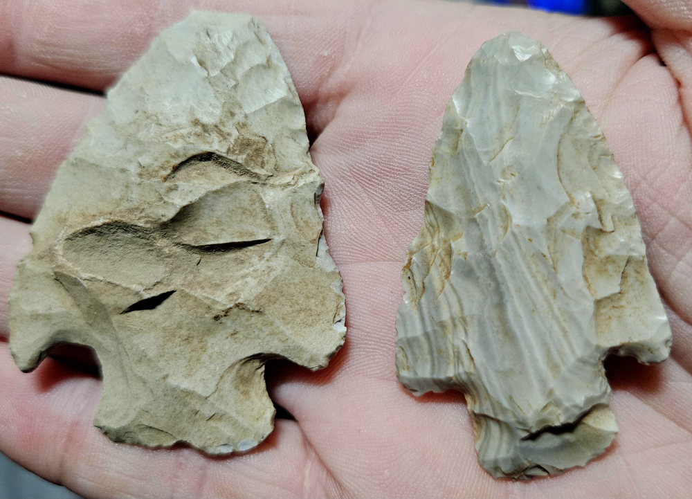 Great pair of hopewellian points from Kentucky. Both well made and the smaller is made of stunning striated chert. Largest measures 2 inches long.