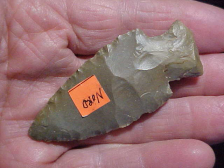 One of those myriad of Hopewell types (Hopewell cluster) from along the Ohio River, Spencer or Perry County, Indiana--length is 2&13/16" by 1&3/16". Being percussion knapped--see the larger, rougher flake scars, the thickness is some 7/17" thick. The point was a hafted knife, not a projectile, obviously--a "Steuben" point style, related to the much thinner Lowe Points of the Late Hopewell--about that time Hopewell (as we call them) were just starting with bow-and-arrow technology, so after this blade style you see much finer worked, much thinner point types--Bakers Creek, Jacks Reef, and finally triangles, true arrowheads. They still had to have hafted knives, so this style likely hung-on for much of the Late Hopewell period--NICE piece of weathered hornstone, REAL. Shipping is $8.00, checks, cash, or M.O.s welcomed, but I do not use paypal-type payment services--Roy A.