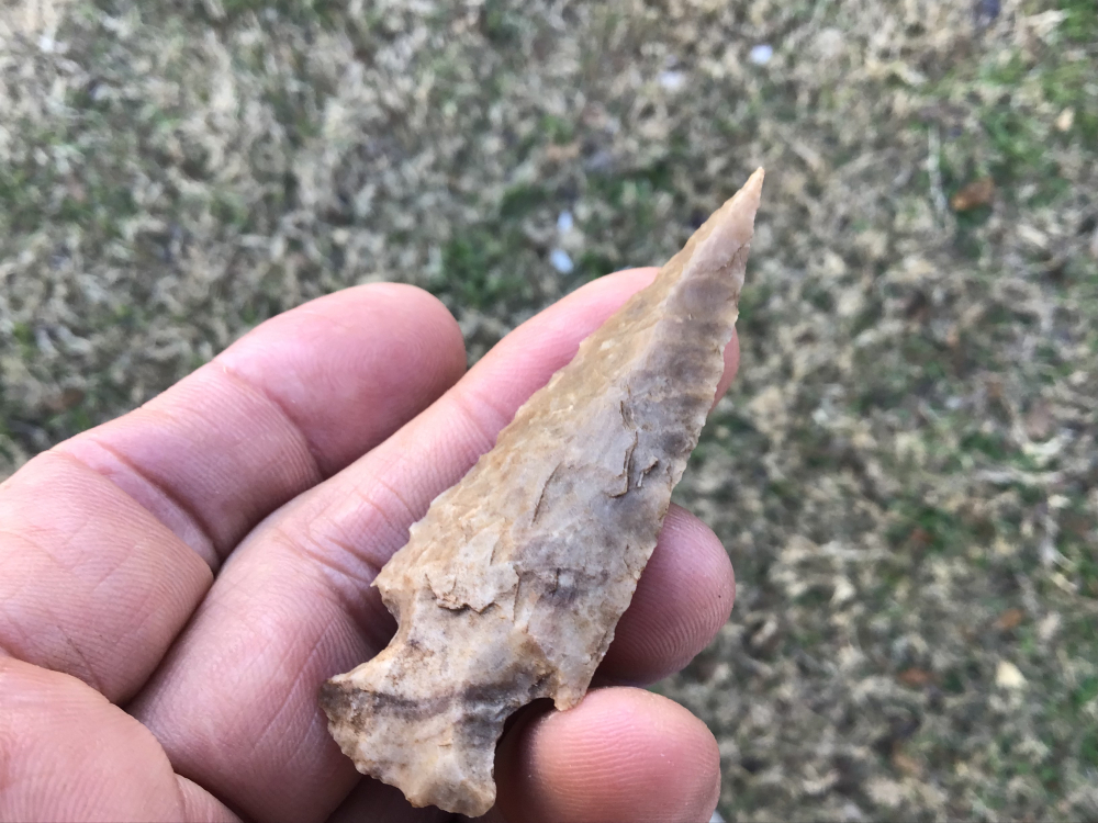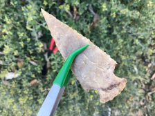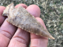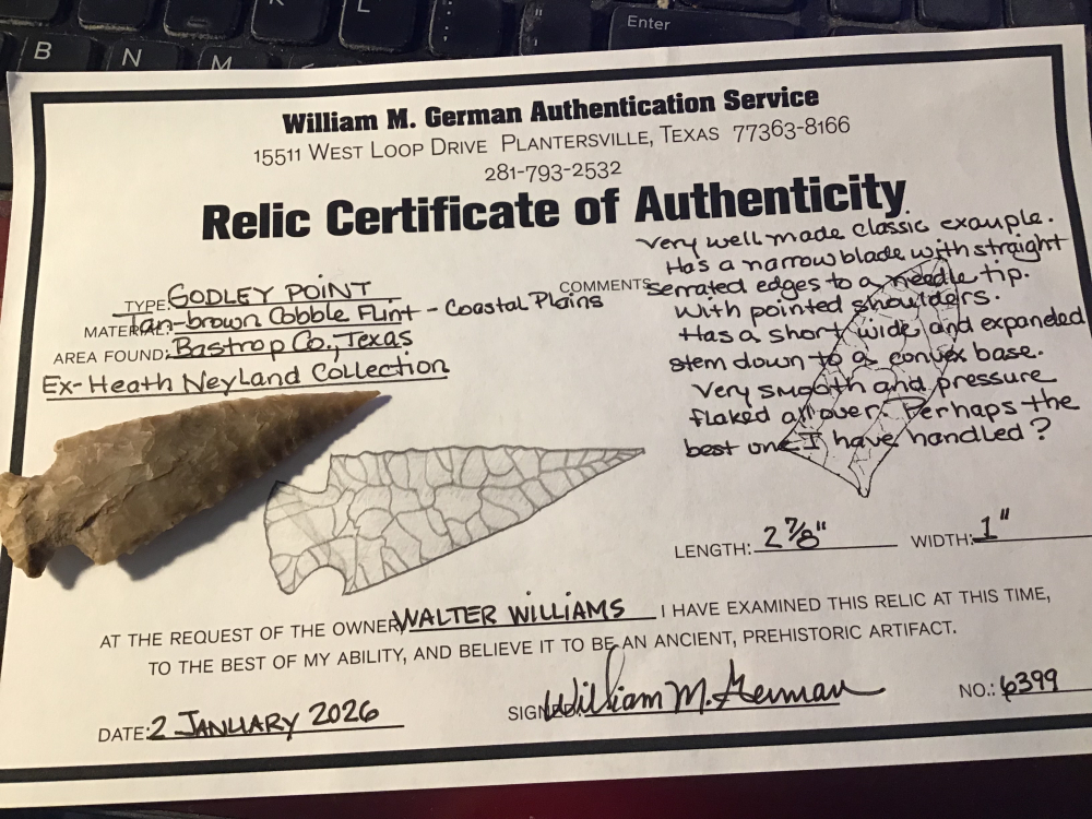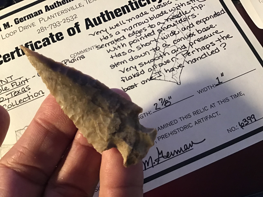 Recovered in Bastrop County and out of Heath Neyland's collection, this is a fine example of the type. Papered by Bill German, he puts it among the best of the type he has papered. It has a needle tip with outstanding flaking and made of colorful Colorado River Gravel with a rounded base. I have the shipping.
