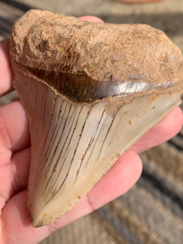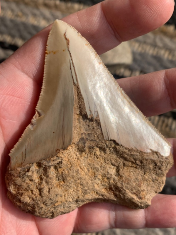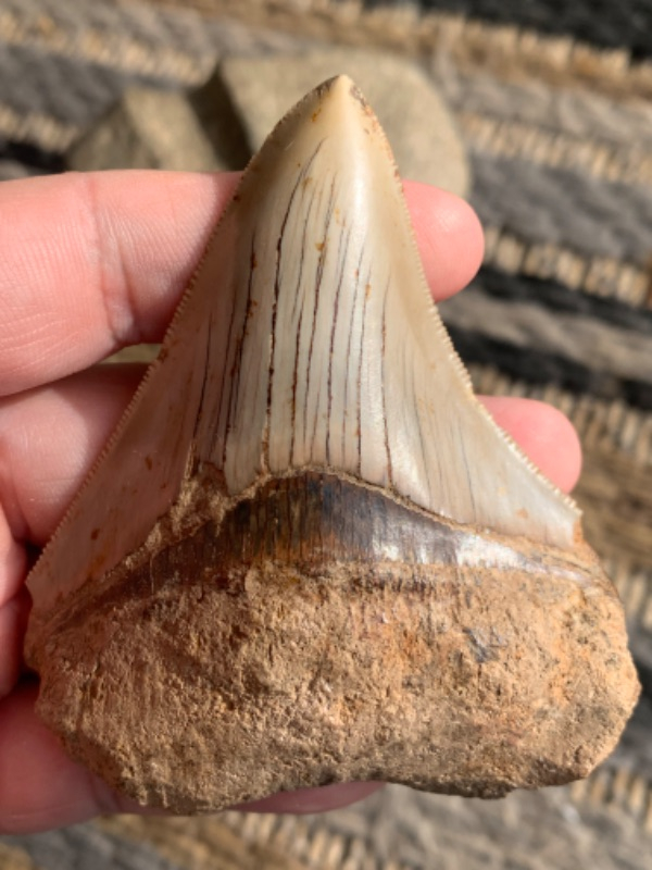 A 3 1/8” heavily Megalodon tooth with bold serrations on it, good blade of tooth also .