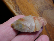 A Spencer or Perry County, Indiana, Adena--close to a Turkey Tail base, but the distinction is so close I'll go with "Adena",caliper reads it as just under 2& 1/16" by 1&1/16"--note the tip, a trace of the old impact fracture that resulted in the Woodland Cult. point being sharpened (and shortened)--whatever the hunter hit, he did it first class (with force), he broke the tip on a better than 5/16" thick blade--it too some force. The repair job, ancient, was well done, but when you examine ANY ancient artifact you ask yourself questions about how they used (and touched-up) damage. How long was the piece to start with--probably 3&1/2"-- this type of flint (Indiana Holland Chalcedony) has so many fracture planes in a big 'chunk' that getting long, thin blades is not common. The red color tells you one other thing-- the point/ knife was near a fire at one time, heat changed the color, iron oxides suddenly stood-out. A good piece, REAL in every detail. Shipping is $8.00, checks or M.O>s (or cash), but please note I do not use paypal if you're buying--Roy A.