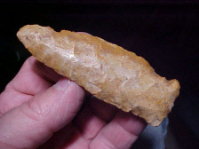 Length of this Kaolin Flint knife is right on 3&1/2" by 1&1/8", and slightly over 3/8" center thickness. The piece was in the Brewer collection , either Union or Jackson County, Illinois, being his collecting area. The point style is more like a Copena than anything--Union County very close to western Kentucky, so I'll have to think this long knife strayed-in from across the Ohio River--VERY nice patina, no info to say the piece was a creek find, but that's how it strikes me--patina is right, as well as the 'tone change' of the flint itself. Shipping is $8.00 with checks, cash, or M.O>s the three ways I welcome payment. Sorry, I do not use paypal-type payments--Roy A.