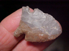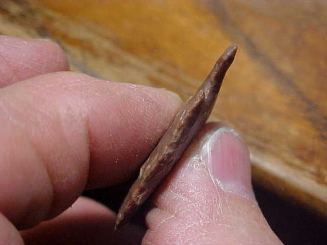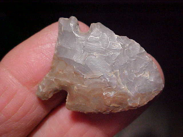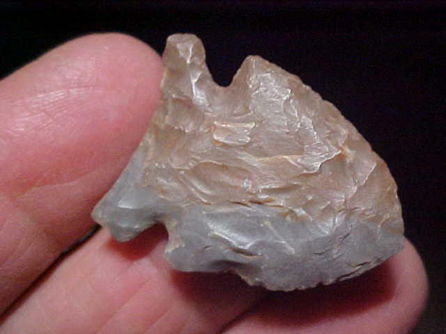 A heavily 'size reduced' auriculate base Early Archaic Big Sandy--1&5/16" with basal edge grinding, extra high-end pressure chipping--and thin, only 3/16" max thickness (1" max width). The flint is actually hornstone, but a grey and red (it's not a cortex, should someone ask)--the color may have been due to some accidental heat exposure, something (like a cookfire) brought out the iron oxides in the flint. The find was part of a very old family collection in Gibson County, Indiana. The man (info will go to the next owner as I believe in sending along the provenance I've collected) put together a frame of some of the best, most colorful dart points I've EVER seen in one collection--good material, guaranteed authentic. Shipping is the $8.00 USPS has as their base rate, and checks, cash, or M.O>s are the only ways I take payments. Sorry, that means you can't pay by a paypal-type payment system--Roy A.