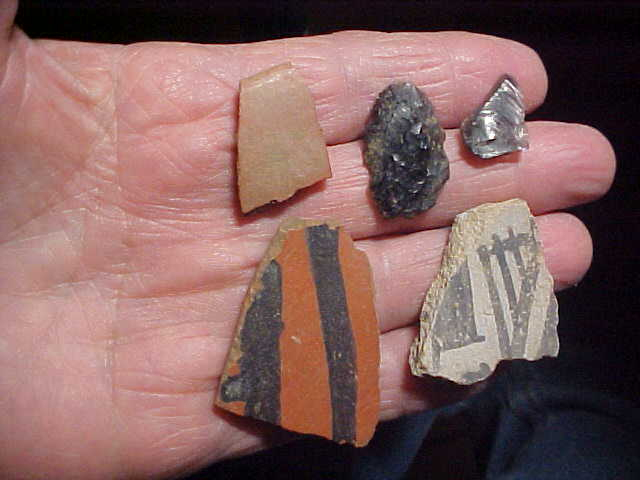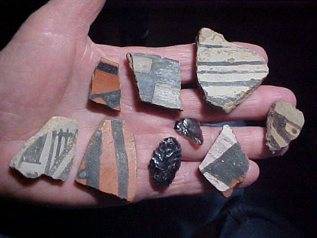 A group of artifacts from a local estate--an obsidian 'arrowhead', a small obsidian flake, and seven painted pottery shards from the southwest part of the United States--the estate gave no indication as to which state the pieces had been found, but being painted that should give some indication. Two are rim shards and a third (slightly larger) shard looks like it was from the same red (with black decoration) pottery vessel. The largest of the seven is 2" across--the volcanic glass (obsidian) point is 1&1/8" in length. Neat pieces that were bagged and included with some local artifacts--wish I had more info to provide, but they're waaaay outside my area of specialty. Shipping is $8.00, checks, cash, or M.O>s welcomed. Sorry, I never-ever use paypal-type services--Roy A.