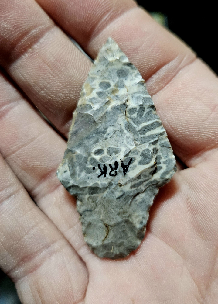 Pretty Dickson point from Arkansas. Super well made on a stunning piece of reed springs chert with lots of crazy motteling. Measures 1 7/8 inches long. Highly recommended point.