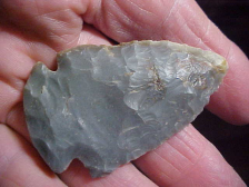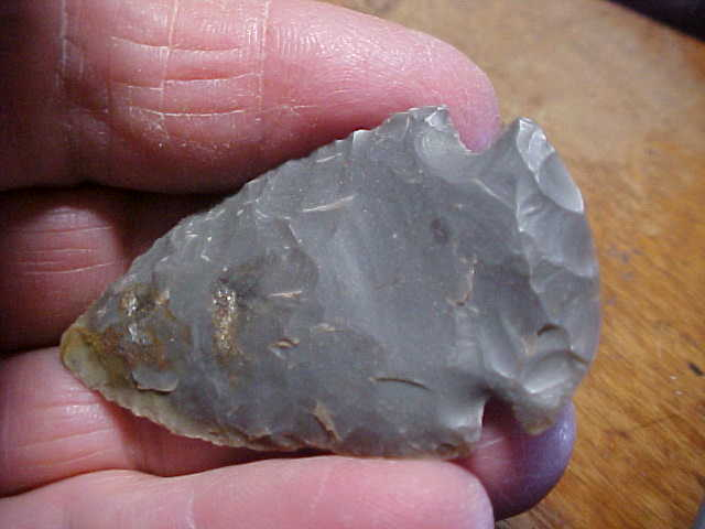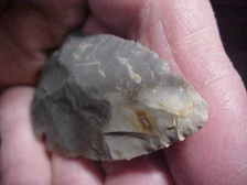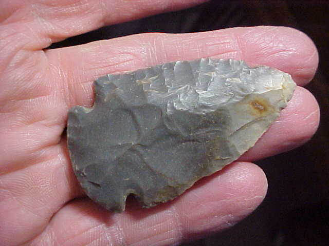 A Dubois County, Indiana, hornstone Dovetail, basal ground, 2&1/4" by 1&5/16", 5/16" max thickness. The piece is out of an old farm collection, the provenance I collected will go to thee next owner, history matters. Every detail is guaranteed authentic. Damage--if you want to call a use-made bit of wear on the very tip 'damage', that's about it. This Dove had only a few sharpenings of the blade, not a great deal of bevel in this stage of Early Archaic use. Shipping is $8.00, and I take payments only by check (cash is fine) or money order. I do not use paypal-type payments--Roy A.