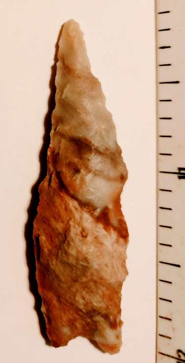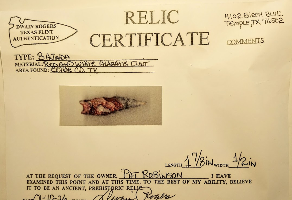 This rare Texas Bajada point is made out of Alibates dolomite. It was found in Ector Co., Texas, and comes with a Dwain Rogers COA.