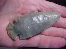 Shipping included on this 3&5/8" by 1&3/8" Waubesa. The piece came out of a Union County/ Jackson County, Illinois, assembled collection, but the flint is either Indiana or Kentucky Hornstone--Richard B., the collector bought selected pieces in addition to what he found--I suspect this one came from a trusted dealer he'd dealt with. The surface: many, many black mineral dots on the surface of the big point/ knife--the patina is no brainer, 100% guaranteed authentic. There is slight wear on the side of the tip, a close up photo should show it. I welcome checks or M.O.s but do not use payment services (like paypal)--Roy A.