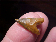 A long 3" by 15/16", center thickness of 7/16" in the hafting area--strong blade, it wasn't going to snap with that sort of tie-on area thickness. The piece come s from a Warrick County, Indiana, collection, made of a really good grade of Indiana Hornstone--patina is excellent, no brainer authentic. Shipping is $7.00 with checks or M.O.s welcomed. Sorry, I do not use paypal-type payment services--Roy A.