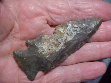 A Gibson County, Indiana, find made of our Harrison County Hornstone,1&11/16" by 1"--barely 1/4" max thickness. Wish I could say the barbs were intact, but this is the way the piece was found, the end chips are ancient. There is great basal edge grinding (always a way to distinguish a Pinetree from a Kirk Cornernotch which seldom had basal grinding). On a closeup I try to tilt a piece (for the camera) so you can see the excellent pressure flaking of the edges, Early Archaic artistry, I think, they were masters of knapping style. So long as I'm alive the piece is guaranteed authentic--get that kind of guarantee from someone else if you can. Shipping is $7.00 and I take payments by check, cash, or M.O.--I do not use paypal-type payment services--Roy A.