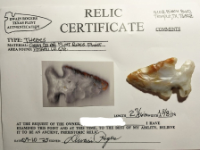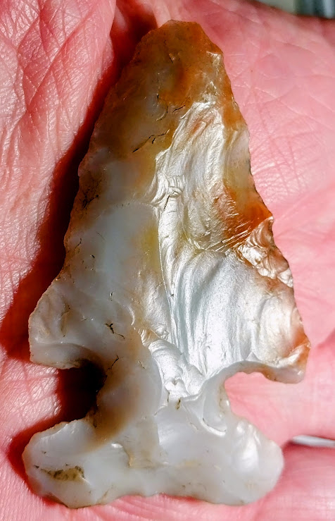 This beautiful Thebes point is made out of colorful, semi-translucent Flint Ridge chert. It was found in Miami Co., Ohio, and comes with a Dwain Rogers COA. They don't come much prettier than this!