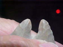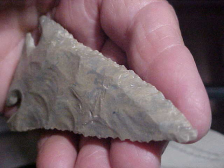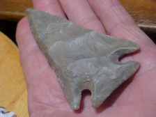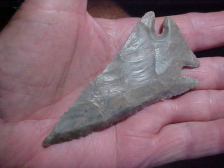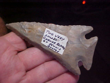 A massive (comparatively) Lost Lake from the Central City, Kentucky area--Muhlenburg County. This hornstone point has been in my collection something like twenty years, purchased from the now deceased finder, Chris Borden---when he needed a newer truck. Now I do, lol. The tip is 100% intact, the one side of the base and barb are fully intact--the opposite barb and basal corner were restored by Dennis Bushey. Dennis took off the auto body filler Chris had used to patch the tiny bit of ancient damage, the small (highlighted) spots were professionally restored and colored. You buy the hornstone point, you know (upfront) the exact condition. Length is a healthy 3&15.5/ 16"--barely under the 4" mark on my caliper. Width is exactly 2", and max thickness is 3/8". The width/ thickness measures should tell you the knifeblade is a very balanced piece, well knapped and serrated. The price (which includes shipping) reflects the restoration--an almost 4" Lost Lake without the restoration would be many times this cost--fact of life. I welcome checks or money orders, but I do not use paypal. Questions are welcome, "offers" are not--Roy A.