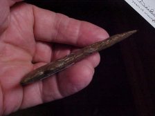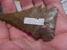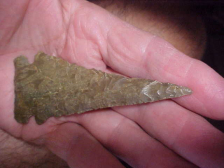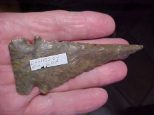 The 2011 Jerry Dickey COA calls the point a Thebes, but my 'take' is still Big Sandy Broadbase--opinions are just that. If you're the next owner you can decide what to call the Early Archaic point out of a creek in Daviess County, Kentucky. Jerry called the flint 'possibly hornstone'---could be hornstone or a high grade of Dover Flint (as I suspect)--4" by 1&5/8", max thickness in the hafting area is 5/16", and most of the blade is in the 1/4" +/- range--THIN. You can feel work polish on one side of the very narrow tip--there couldn't have been much pressure on the tip or it would have snapped, but the use was sufficient to leave the tip polished on one side. The base has super edge grinding--both Big Sandys and Thebes were known for their polishing of the basal edge. The price includes the shipping cost--COA shipped in an envelope so it doesn't get bent. I welcome checks or money orders, but do not use paypal-type payment services. One more small note: if you see the price, you know what it'll take to buy the point--Roy A.