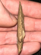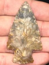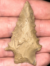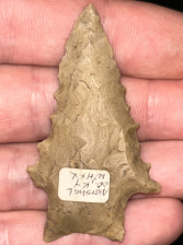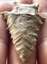 A fantastic Stemmed Kirk found in Marshall County, Kentucky. Made from heavily patinated Camden chert with great mineralization. Well made with excellent form and serrated edges. Ex: Robert Overstreet of the Overstreet Identification and Price Guides. Also comes with a Davis COA.