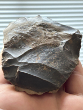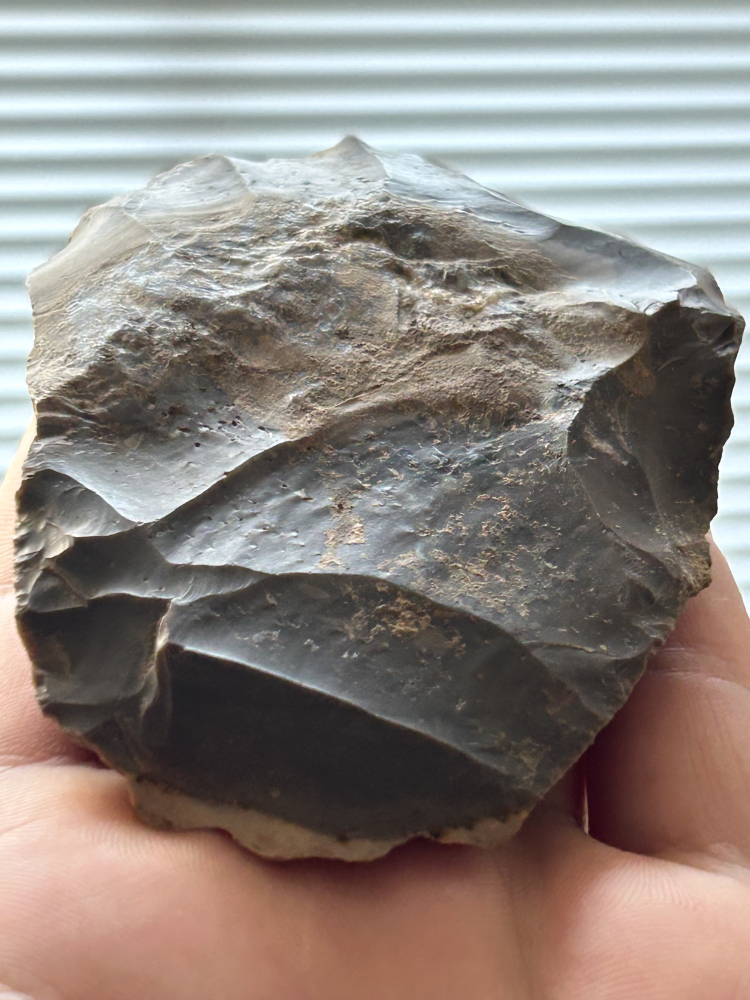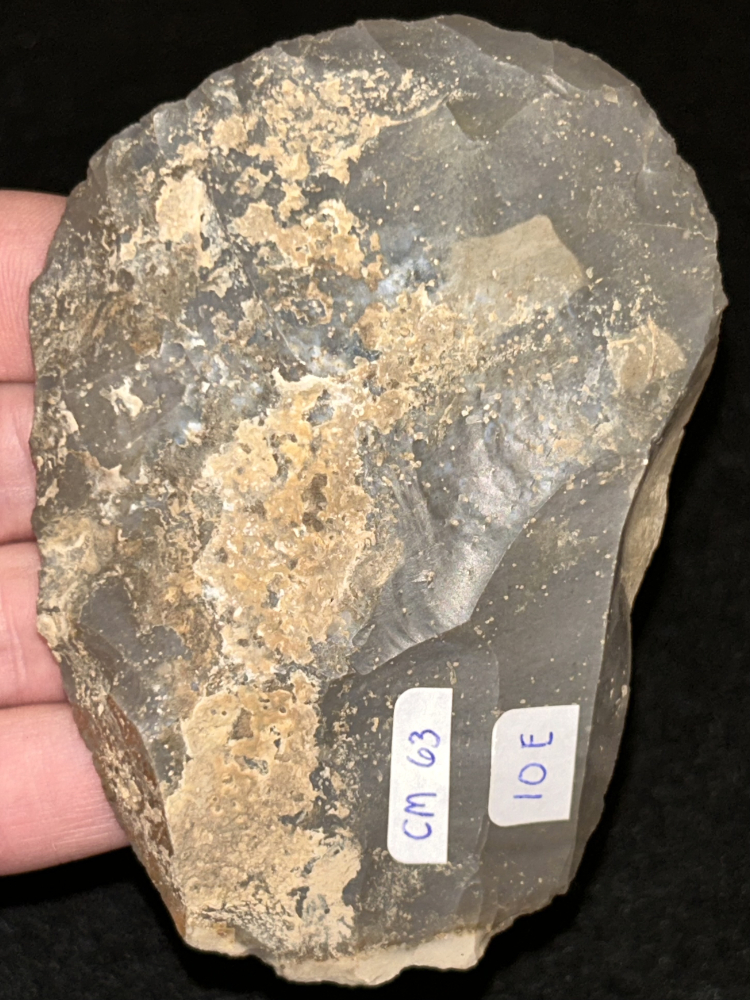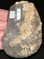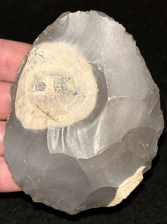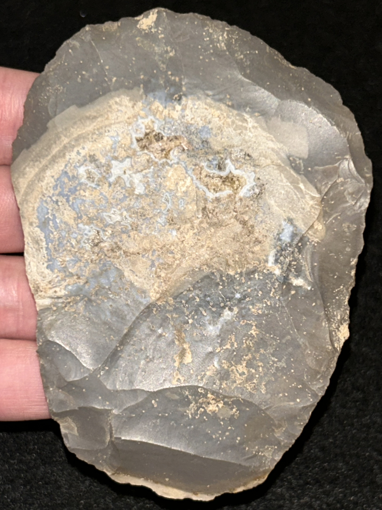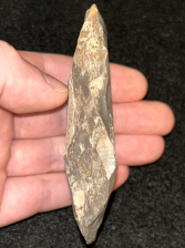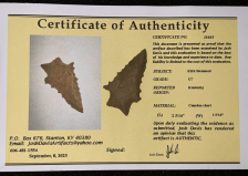 An excellent cache blade from the famous cache of 10,000 blades found at the Crib Mound in Spencer County, Indiana by Art Gerber, Chuck Denzinger, and Buddy Scheidegger. Made from Hornstone with a nice blue and white inclusion. Well flaked with a touch of cortex remaining on one end.