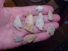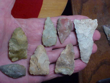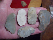 Sorting through a box of Gibson County, Indiana, tools of various sorts, all found along the Wabash River, these twenty are "group one". They're real, they comprise the flints, the point styles, the preform styles that were 'step one' to making finished point/ knife forms. The points themselves saw a lot of use, little dings or chips that might have prevented their salvage (and reuse)--as long as a point could be made into something else, whether it was a hafted scraper or a shaft scraper, it WAS...doesn't mean they didn't get reused, only that we haven't figured just what that later use was. Shipping is included with the price, and as I do not use paypal the only way to purchase the group is by check, cash, or M.O.--Roy A.