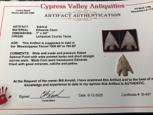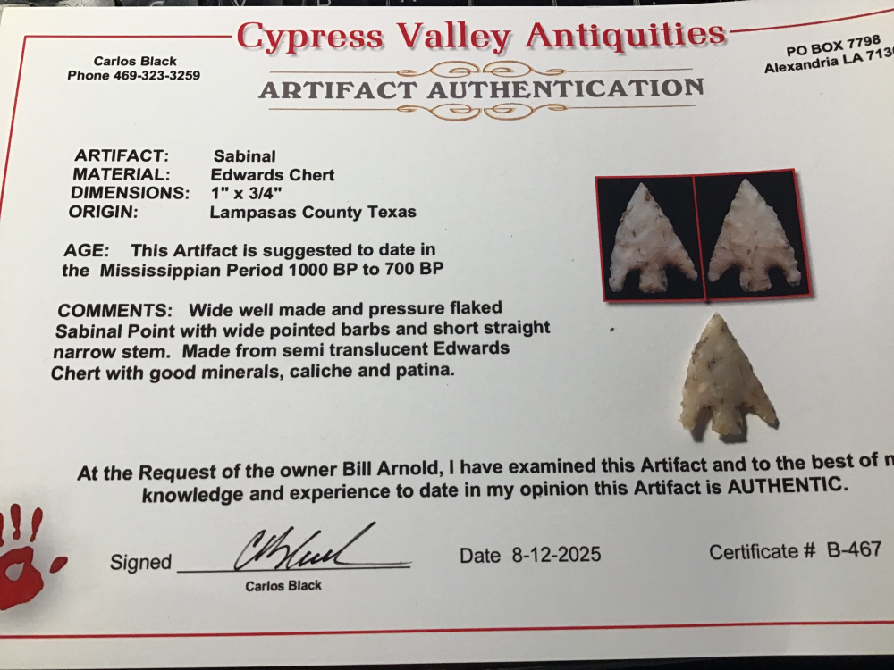Very beautiful point from the Mississippian Period recovered in Lampasas County. It is a well made semi-translucent Edwards with fine patina. I have the shipping.