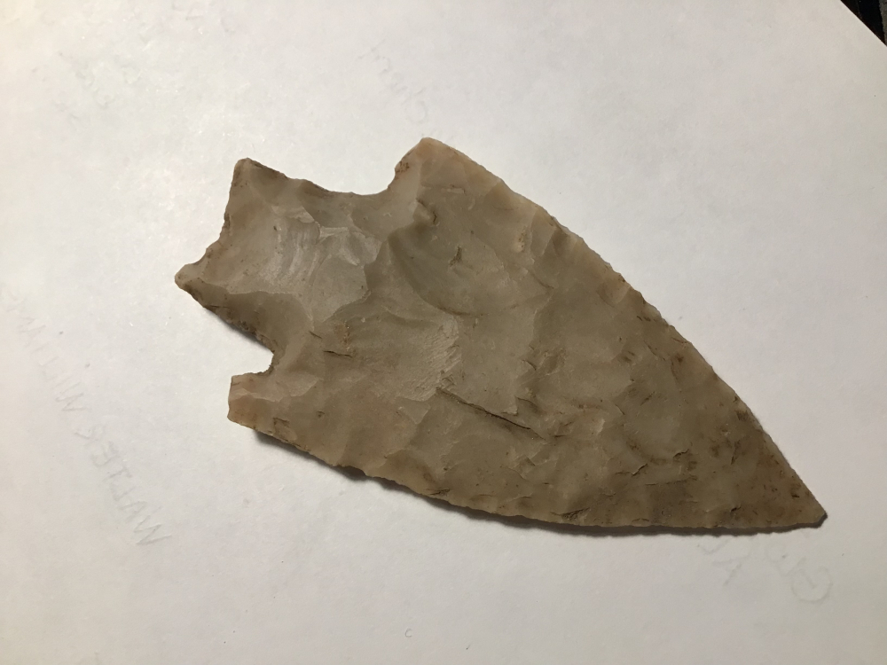 This is a nice sized Marshall recovered in Bandera county. It is thin and well flaked with small ancient dings on the barbs. Semi-Translucent, it has a good tip with fine pressure flaked lateral edges. I will guarantee authenticity and satisfaction.