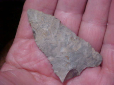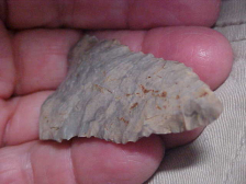 Shipping comes with the price on this hornstone creek find from the Daviess County, Kentucky, area (could be Ohio County, depending on the particular creek they were hunting that day)--a piece I've had in my collection for over fifteen years. An ancient break on a basal tang of the Nuckolls Variety Dalton aside, the flaking is absolutely great, the serrations formed by the oblique/ diagonal flaking technique. Length is 2&9/16" by 1&5/16", 5/16" is the max thickness--symmetrical. Both faces show basal thinning that's equivalent to fluting (just not as deep), and what remains of the basal edge shows grinding. The finder is an old friend--read that as my having more than 100% confidence the point is real--John knows flint, first introduced me to creek finds some twenty+ years back. Note that on the dished-in basal tang there is strong polishing of the damage--that allowed continued use of a fine VERY Early Archaic point--the DAlton hunter also salvaged a tip-edge nick, formed it as a slight bevel (see photo). I welcome payments by check, cash, or M.O., but do not use paypal-type electronic payments--Roy A.