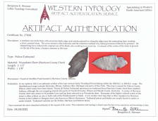 A fantastic cache blade from the famous cache of 10,000 blades found at the Crib Mound in Spencer County, Indiana by Art Gerber, Chuck Denzinger, and Buddy Scheidegger. Made from medium grey Hornstone with a nice large inclusion. Well made with good symmetry.