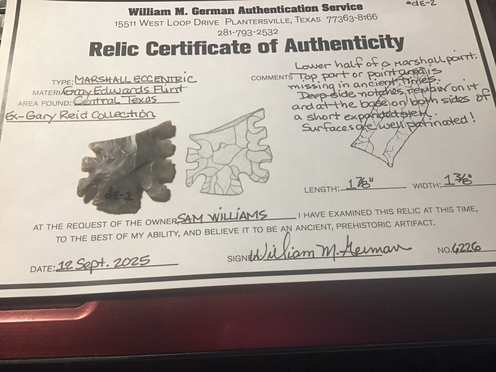 Our of the Gary Reid Collection, I only have Central Texas for provenance, but it sure looks like Georgetown chert so that would put it in the Williamson County area. It is the Lower Half of a Marshall point with all areas well patinated. I have the shipping and it comes with a Bill German coa.