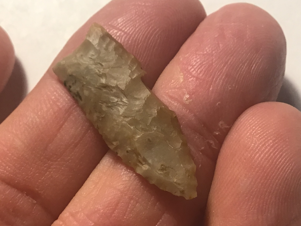 Recovered in Kerr County many years ago, this Midland point has fine pressure flaking on both sides with ground stem edges with an ancient nick on the side.