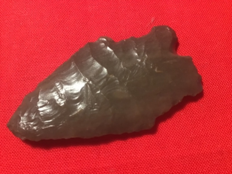 Dark Glossy Woodford chert recovered in Haskell County, Oklahoma out of the Billy McLemore Collection. Full Provenance on the Bill German COA. It is river tumbled with fine Cody Flaking on both sides.