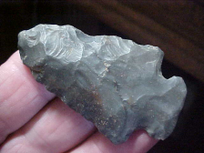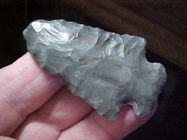 Sometimes you pick up a point and wonder what the heck they did with it--what'd they use the piece for due to ancient wear and-or damage. This Early Archaic Thebes, what's puzzling here is that the blade edges are as battered as though the point had been used to smooth a rock--doesn't make sense, but under 10x power the work is ancient, there aren't the tiny white hinge fractures you'd find on modern damage. The 'blunting' of the edges goes around the tip, too, it's super-heavily worn. History & measurements: Gibson County, Indiana, hornstone, 2&3/8" by 1&3/8", and a thickness of 3/8"--that thickness would indicate a far larger blade as the piece was first made as the thickest area is near the tip. I've owned a lot of Thebes (I collect them), but have no ready explanation for this one--I only know it's real. Shipping is $7.00, checks or M.O>s are welcomed. Sorry, I do not use paypal--Roy A.