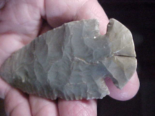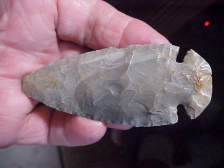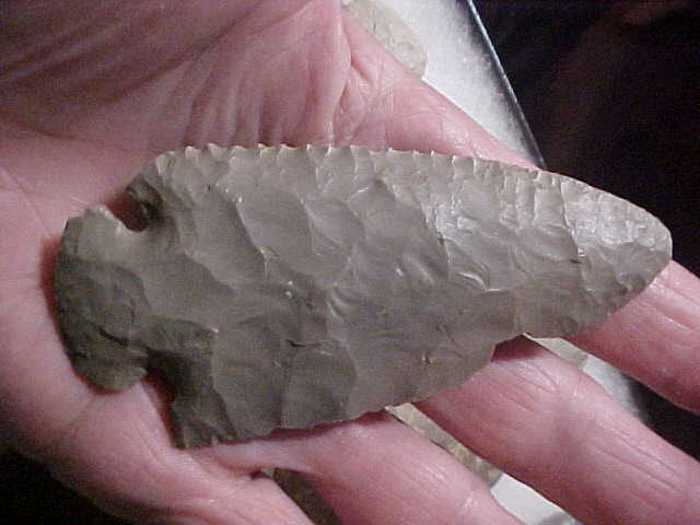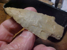 My caliper reads on the 'low side' of 3&1/2", so close you see the bar measure almost touching 3.5"--that's a pretty good size Dove for Indiana Harrison County-type Hornstone. Width is 1&3/8", center of blade thickness is 3/8"--as the photos will show, there is very little bevel sharpening, the blade had not much usage (resharpening) after it was first a Cobbs Knife (preform for an early stage Dovetail). Basal grinding is excellent. A slight use-wear to the tip indicates the Early Archaic era user/ hunter was working the tip as a gouge--under magnification you can see wear polish--his work may have worn away an eighth inch of the length, hardly any more than that. I'm assuming this was a creek find based on the STRONG patination, Warrick County, Indiana--the finder, now deceased, can't tell me that, only the heavy mineralization can. To say it very simply: as long as I'm alive the piece is guaranteed authentic, it'll always be welcomed back in my collection. One note--the base shows a slight 'cleft' in the flint itself--the price reflects that 'fault line'. Shipping is $8.00, packed very, very securely. I welcome checks, I welcome money orders, but I do not use paypal-type payments--Roy A.