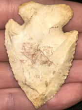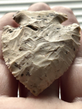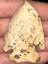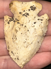 A fantastic Thebes found in Morgan County, Indiana. Made from Burlington chert with superb mineralization. Nice form with serrated beveled edges and sharp tip. Ex: Dr Peter Ward collection.