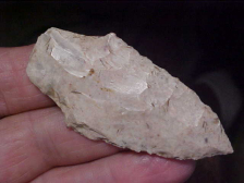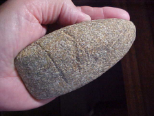 A granite Woodland Era Celt from Vanderburgh or Posey County, S.W. Indiana--FIELD found--as the plow creases demonstrate, but just to find a 4&7/16" by 2&5/16", 1&7/16" Celt in plowed fields anymore is an accomplishment. To its credit, if you rub the bit it's some impressive bit-edge polish. How many hours it took to give the front inch (plus) that strong of a polish must have required some effort...not a ten minute job, definitely. Note on the one face there is a built-in 'slot' for a celt head tightening wedge--a wood or bone wedge could be inserted to hold the chopping head tighter--as needed---read that 'as the sinew stretched'. The two thousand year past toolmaker planned ahead, give him credit. Due to weight priority mail shipping, $11.00, and payment is limited to checks (cash) or M.O.s--I do not use paypal--Roy A.