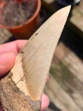 A 3 7/8” Megalodon tooth with root filler repair