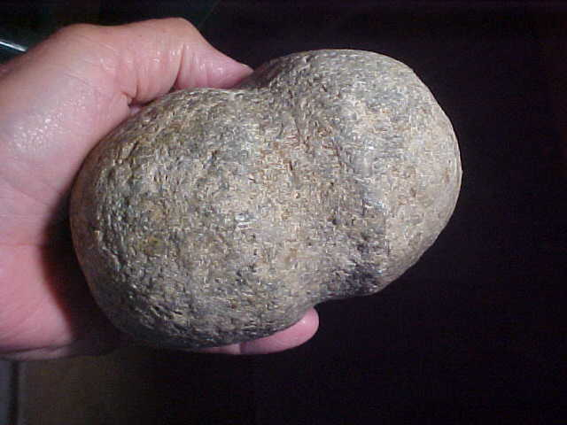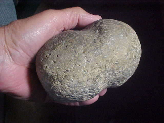 Either a Greenstone or a green quartzite, heavy rascal. No matter the length of the handle this Maul was mounted on, swinging it was a recipe for sore shoulders that night. Out of the Sangamon County, Illinois, area the green 'quartz-like' stone is (just guessing) about four lbs--length is 4&5/8" by 3&15/16", 3" or fractionally over in height. The patina is there, it's 100% real. The finder had a lot of white flint in his collection, but nothing else like this big "warclub"--authentic, and a neat piece in anyone's collection. Shipping is $13, checks or M.O.s are the two ways to purchase it as I do not use paypal-type services--Roy A.
