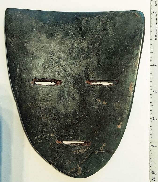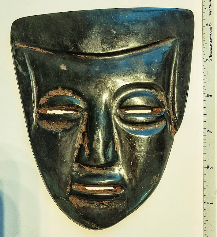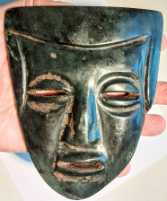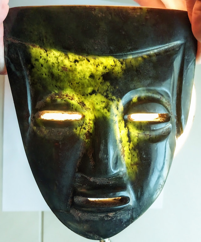 This phenomenal Pre-Columbian Death Mask is made out of a rare, green, semi-translucent Jade. It's likely from the Mayan/Olmec cultures where it was believed that the transformation of the deceased into spiritual beings was facilitated by these masks, which embodied both the physical and spiritual aspects of the individual. At over 6 inches in length and over 5 inches in width, this mask is very large for its type and thin enough to easily show its translucence when backlit. It is a fantastic piece of artwork and available at a very reasonable cost.