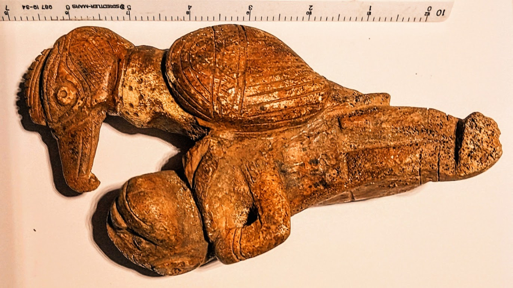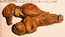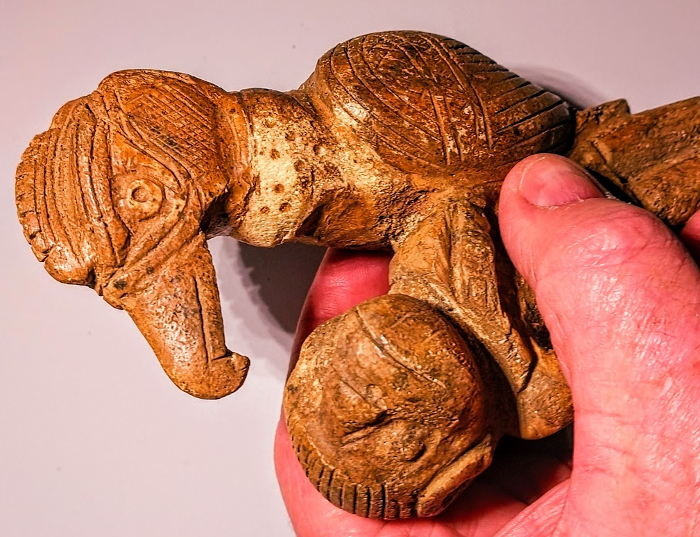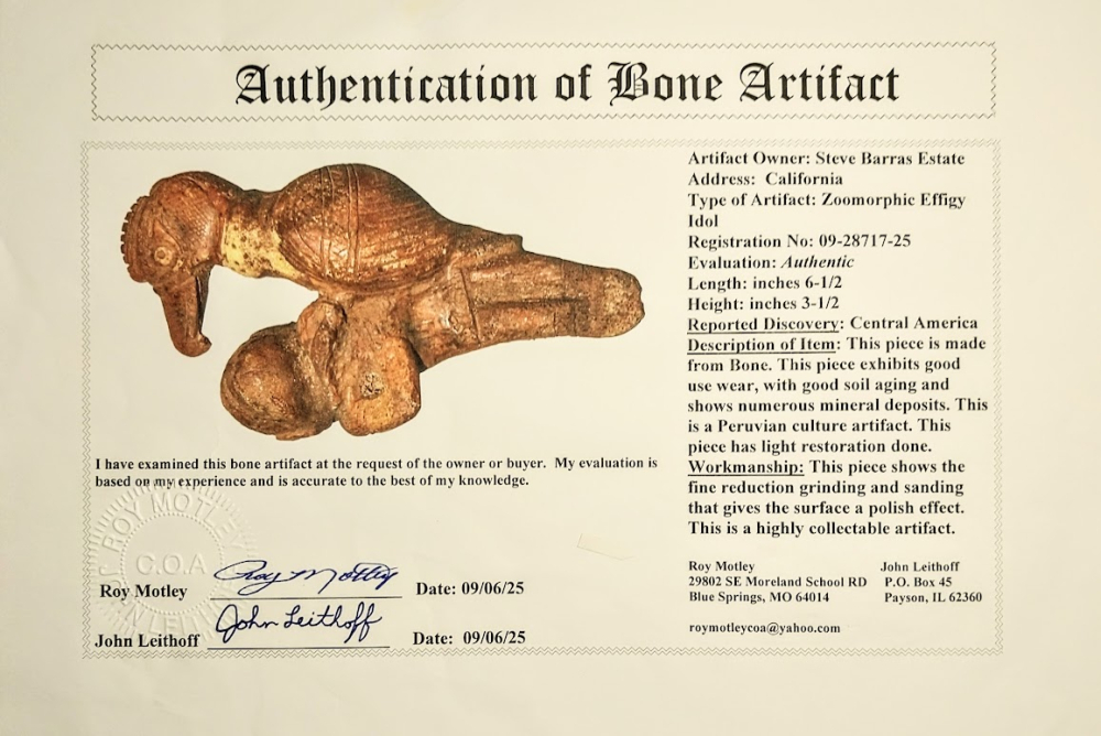 This is a very unusual Pre-Columbian Bone artifact of a Peruvian Vulture eating a Monkey. It is highly detailed, showing intricate features of both creatures. For those of you who collect unique items, this work of ancient art certainly fits the "Bill." The head of the vulture was broken off at some point in the past and was repaired with minimal restoration, as set out on the Roy Motley COA accompanying this authentic piece. You'll never find another piece like this, so don't let it get away!