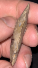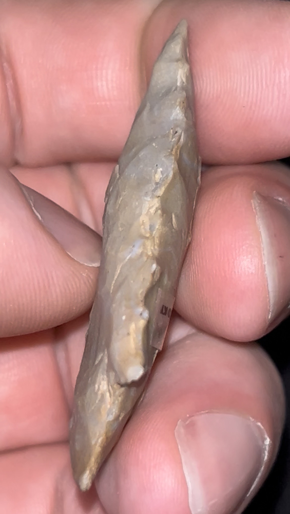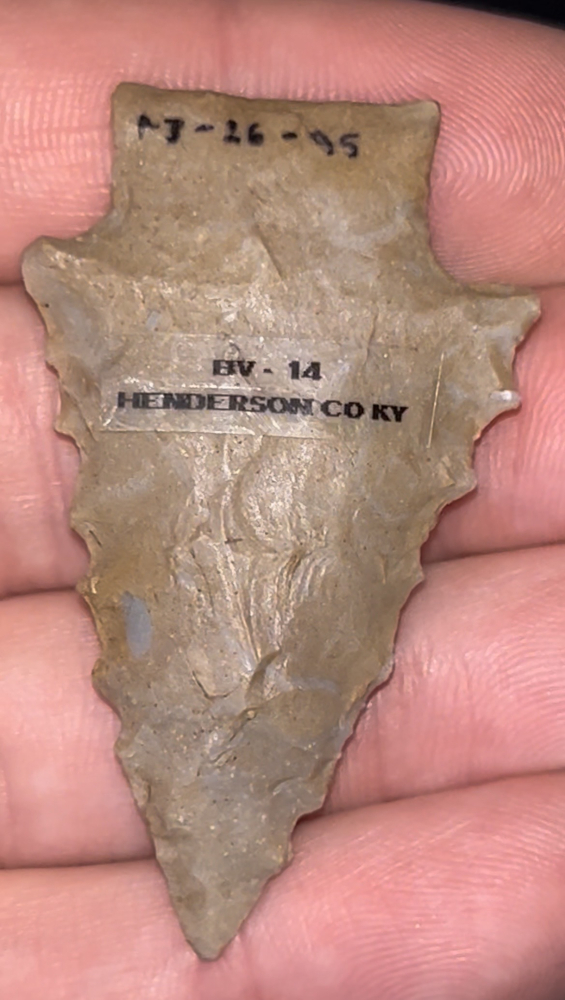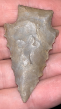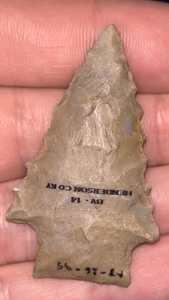 A fantastic Stemmed Kirk found in Henderson County, Kentucky by Robert Doyle in the 1980s (exact location available to buyer). Made from well patinated grey-brown Hopkinsville chert. Well made and in good condition with nicely serrated edges. Ex: Brandon Vanderver.