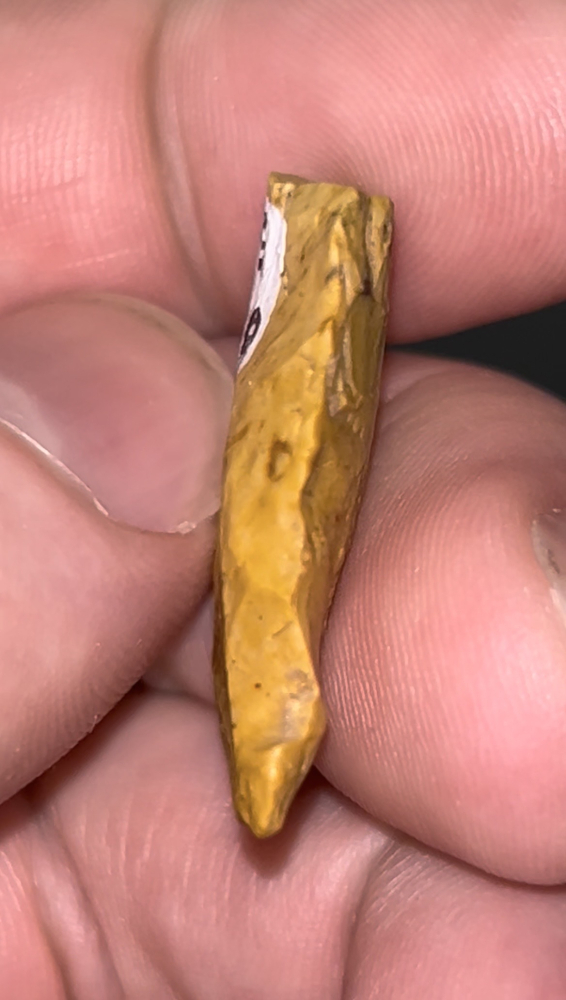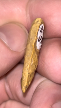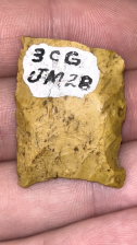 A nice Clovis base, find location unknown. Made from a heavily patinated golden yellow chert. Good grinding and light fluting on both sides.