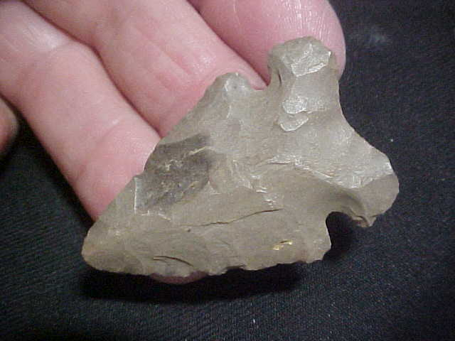 An Edwards County, Illinois, find by Norman Reid, 1951 if I'm correct in reading the year Norman notated on the point (the last digit is either a 1 or a 6). The 1.75" hornstone point, whether you wish to call it a Contracted Base Big Sandy or a Graham Cave---or even an 'exhausted Thebes', it's in that very early part of the Early Archaic Period--7500--8,000 BP. Basal grinding is excellent, the tip has a "Thebes-like" twist to it (see pic) that only comes with extensive sharpening of the blade. The tip has some rub polish to indicate the end was used as a buffing tool after there was little cutting edge left to the knife. The full provenance of the piece will be on the printed out item description when I ship the piece. Shipping is $8.00 with checks or M.O.s how I welcome payments. Sorry, I do not use paypal-type services--Roy A.