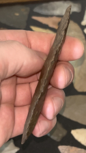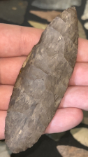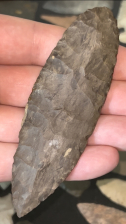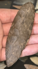 An excellent bi-pointed blade found in Montgomery County, Tennessee. Made from mottled brown Dover chert. Thin and well made with good size.