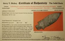 This Symmetrical Etley point was in a fire and has fire pops on both sides, although they do not distract from the beauty of this artifact. This Etley was found in St. Louis Co., Missouri, and comes with a Jerry Dickey COA.
