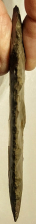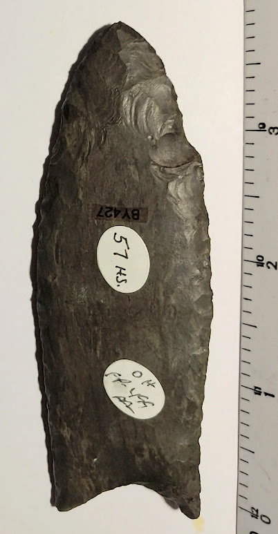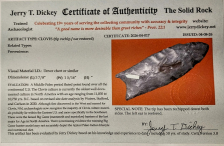 This Large Dover Chert Clovis has a restored ear and a tip that has been rechipped. Because of these problems, this Clovis is a very affordable example of this rare point. This Clovis was found in Ohio, and comes with a Jerry Dickey COA. It was formerly in the collection of Walt Macintyre.