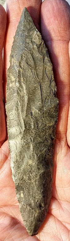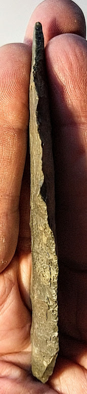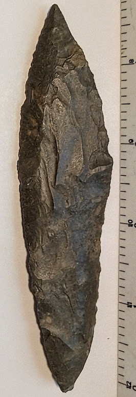 This large, Four Bevel Harahey Knife has a great "propeller effect" from repeated sharpenings. It was found in Bell Co., Texas, by Bill Arnold, and comes with a Dwain Rogers COA.