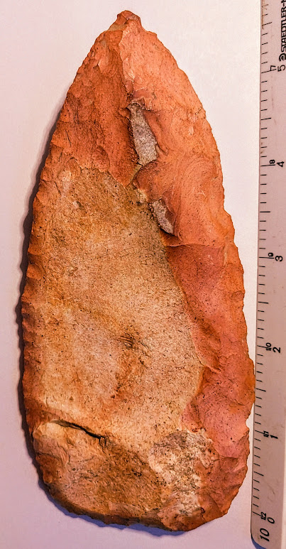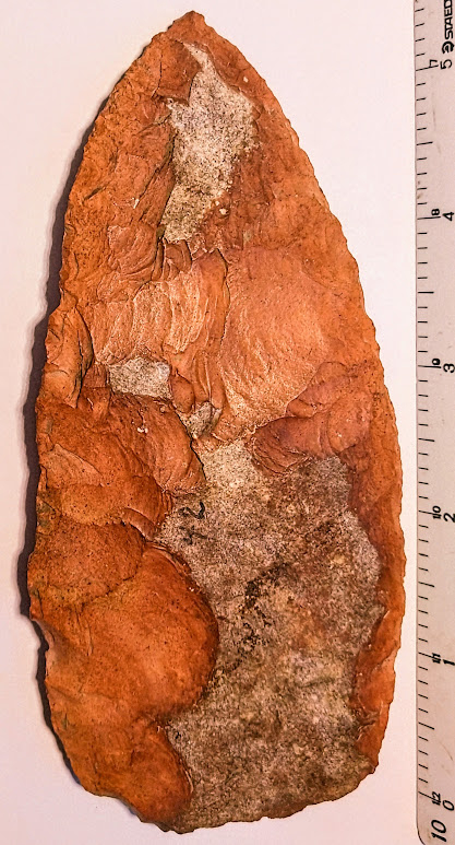 This beautiful Cache Blade is made for a striking red chert. It was found in Woods Co., Ohio. This piece would look great in any color frame!