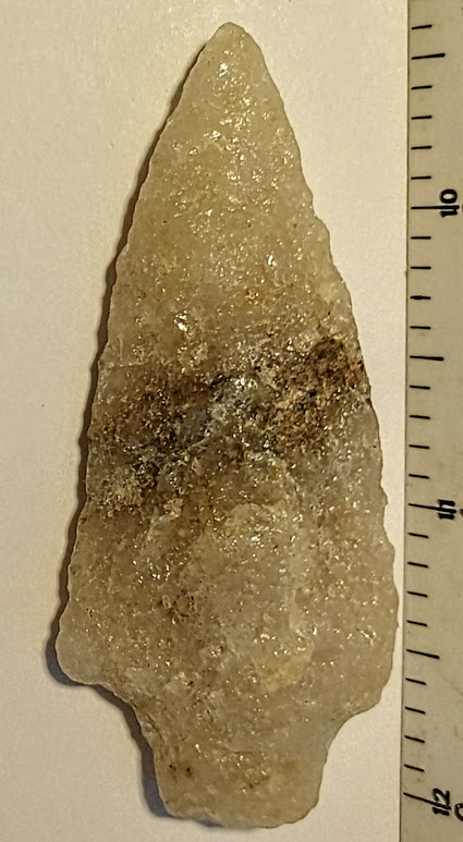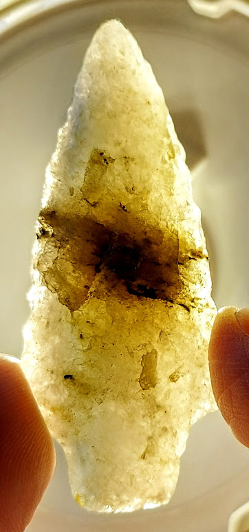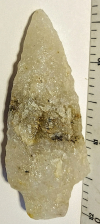 This Middle Archaic Appalachian Point is made out of semi-translucent quartz. This symmetrical point was found in North Carolina. Quartz from this area is extremely hard to work with, and the maker did a great job with this piece!