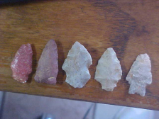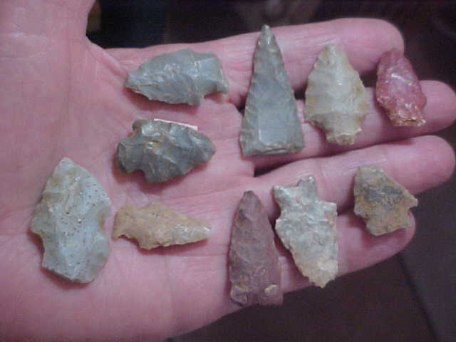 A mix of Harrison County-quarried Indiana Hornstone and Perry County, IN Derby Flint--along with a couple that are made of river pebble Red Jasper--easy to recognize those by their color. The longest point is a hornstone Snap Base (salvaged and edge-polished by the Woodland Culture user) Buck Creek point, not quite to 1&3/4"--very thin for the length of the point. The Turkey Tail point made of Derby Flint is another that was heavily used and salvaged (as they so often did), 1&7/16". The mottled-color bifurcated Kirk Stemmed is another very thin piece--the flint may be in the Spencer County, Indiana, found "Holland Flint" family--that's as close as I can classify it--unusual color for 'Holland', but ancient hunters, tracking deer through area creeks would stumble on small flint outcrops, take "chert samples" home for the village knapper to work. Maybe, if he approved, they went back for more--but sometimes you find only one or two pieces (on a campsite) and try your best to identify who/ what/ where. These ten come from an Evansville, Indiana, area collection, each is guaranteed real. Shipping is $8.00 with payment to be by check or money order. Sorry, I do not use paypal-type services--Roy A.
