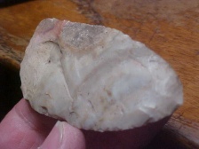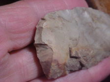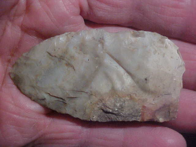 What looks like a higher grade Mozarkite Chert--could be a look-alike chert, too, but found in Sangamon County, Illinois, this Paleo point was a "didn't make the cut", 'stacks' in the chert made the fluting process go south. Likely the piece ended up as a hand-held knife. One face shows the first flute strike, it ended at a somewhat larger 'stack'--some Paleo-made salvage of the base, a bit of basal edge grinding to easily hold the knife, they 'made the best of it'. Anyone who thinks every knapping attempt was successful, hey, hunt a lithic workshop near a flint source, you'll find THOUSANDS of broken blades---I have box-after-box of things I've hauled home--want some??? This Paleo measures 2& 13/16" by 1&7/16", 3/8" max thickness, so the knapper was skilled enough to thin his preform without narrowing it too extensively. Shipping is $8.00, checks or money orders are how I receive payments. Sorry, I do not use paypal-type services--Roy A.