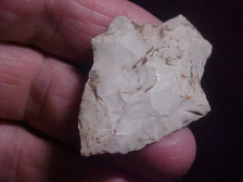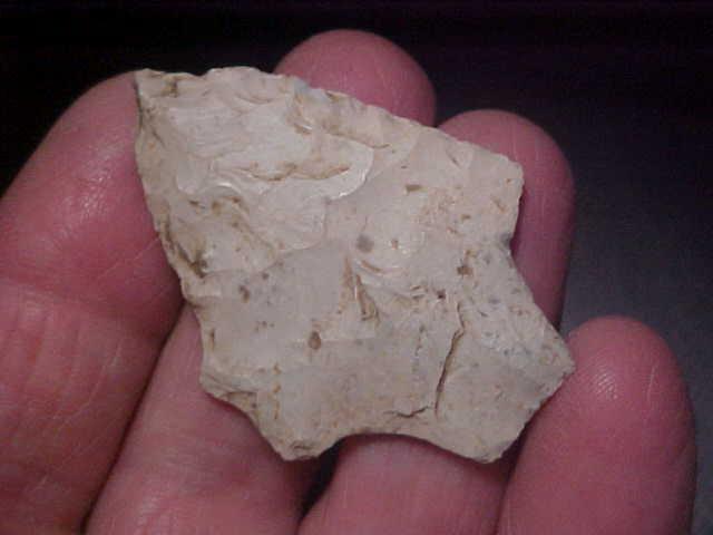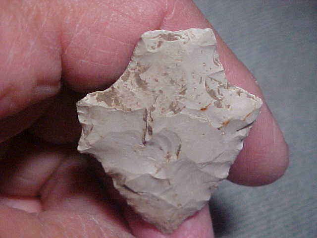 Very, very thin Dixon Point (A Gary to some), 2" by 1&3/8", but max thickness is only slightly over 3/16"--thin blade, definitely. Both the tip and that side 'burin' show work as 'leatherworking features'--read that as use polish, particularly the tip, you can spot the narrowing of the tip to make a leather punch. The stem shows excellent edge grinding. Note that the Sangamon County, Illinois, Dixon has not been cleaned--what you see isn't large mineral deposits--although it IS well mineralized--but prairie soil from Illinois. The flint is a decent grade of Burlington Chert. Every detail is guaranteed real, period. Shipping is $8.00 with checks or M.O.s how I receive payments. Sorry, I do not use paypal-type services--Roy A.